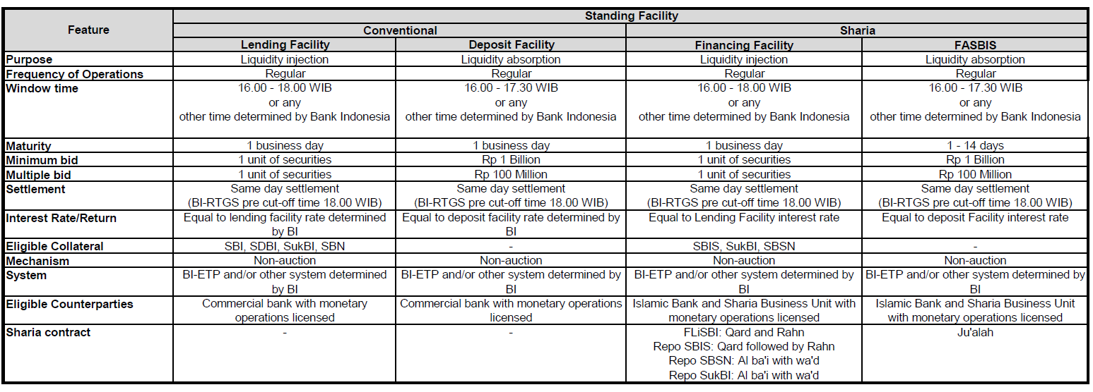 Standing Facilities are conducted to maintain adequate liquidity for Monetary Operation Participants at the end of the day. Standing Facilities are implemented through the provision and placement of rupiah funds, conducted either conventionally or based on sharia principles.