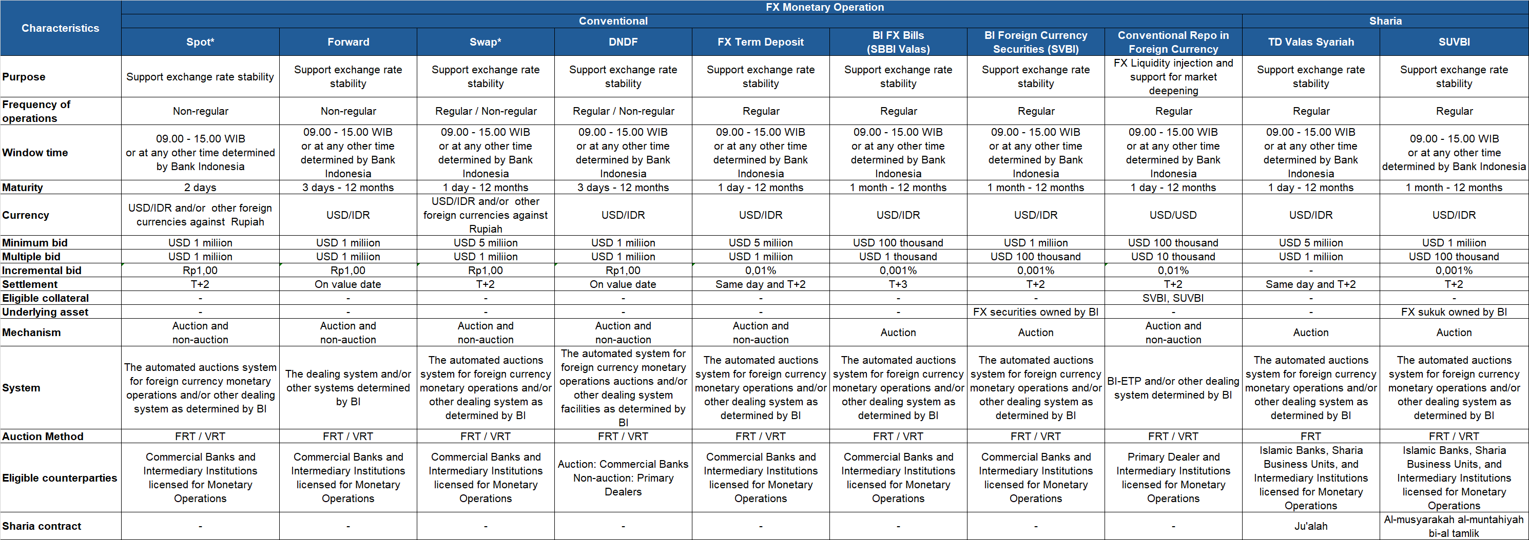 Foreign exchange monetary operations (FX MOs) are conducted to manage liquidity and maintain the stability of the rupiah exchange rate. FX MO instruments consist of the issuance of Bank Indonesia securities, repurchase agreements (repos) and/or reverse repos, term deposits at Bank Indonesia, foreign exchange purchase and/or sale transactions, and/or other transactions in the money market and foreign exchange market. FX MOs are conducted with a minimum tenor of 1 (one) day and a maximum tenor of 12 (twelve) months.