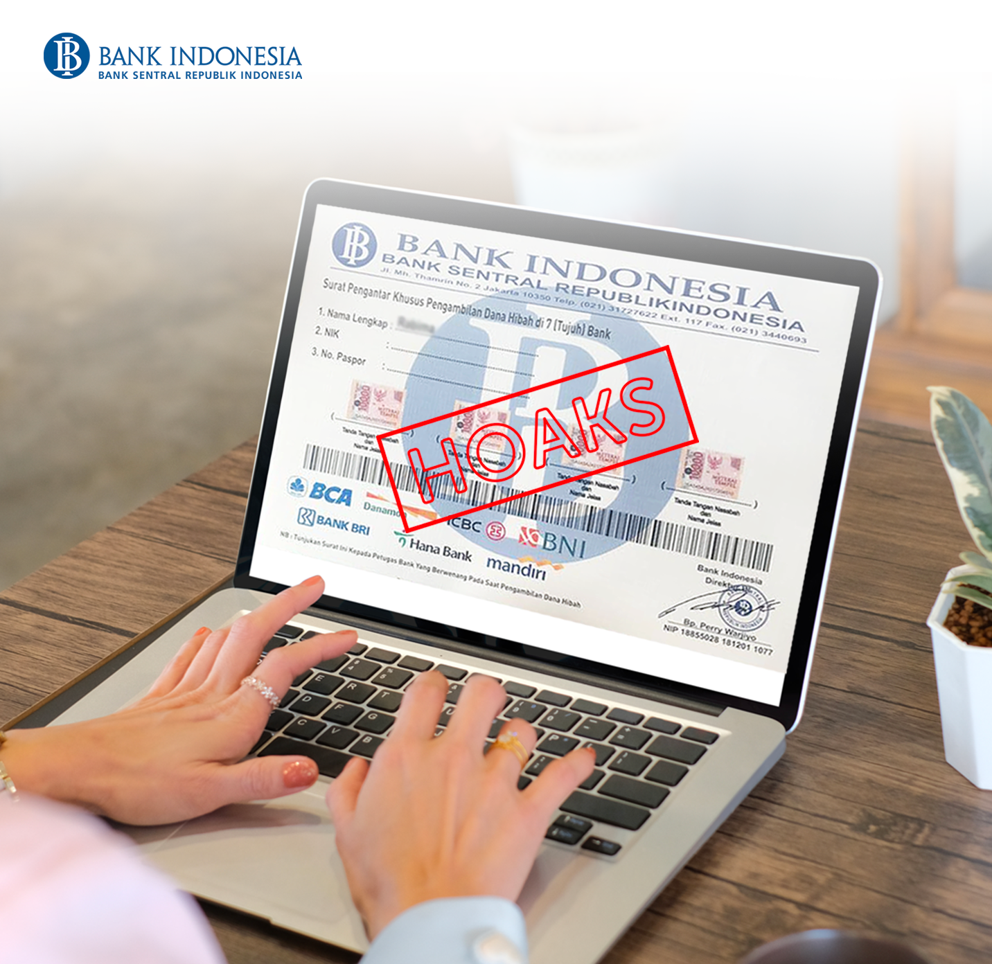 Bank Indonesia tidak bekerja sama dan tidak terafiliasi dengan perbankan atau lembaga apapun dalam pelaksanaan hibah. Jadi, modus di atas sudah pasti tidak bisa dibuktikan kebenarannya ya, Sobat. Selain itu, BI tidak menerbitkan "Surat Pengantar Khusus Pengambilan Dana Hibah" atau sejenisnya, serta tidak memungut biaya apapun dalam pelaksanaan hibah.