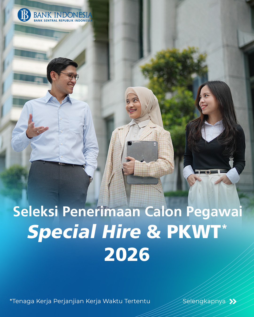 Bank Indonesia membuka peluang emas bagi Anda melalui Rekrutmen Jalur Special Hire (SH) dan Perjanjian Kerja Waktu Tertentu (PKWT). Kami mencari individu berpengalaman dan berkompeten yang siap berkontribusi untuk kemajuan Bank Indonesia.