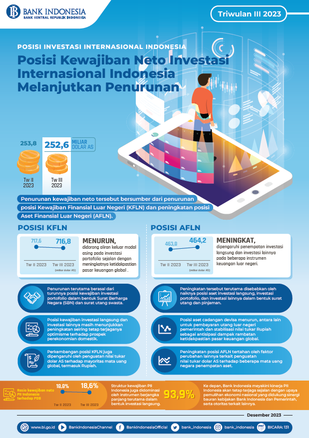 Posisi Investasi Internasional (PII) Indonesia pada triwulan III 2023 mencatat kewajiban neto yang menurun. Pada akhir triwulan III 2023, PII Indonesia mencatat kewajiban neto 252,6 miliar dolar AS, turun dibandingkan dengan kewajiban neto pada akhir triwulan II 2023 sebesar 253,8 miliar dolar AS. Penurunan kewajiban neto tersebut bersumber dari penurunan posisi Kewajiban Finansial Luar Negeri (KFLN) yang dibarengi dengan peningkatan posisi Aset Finansial Luar Negeri (AFLN).