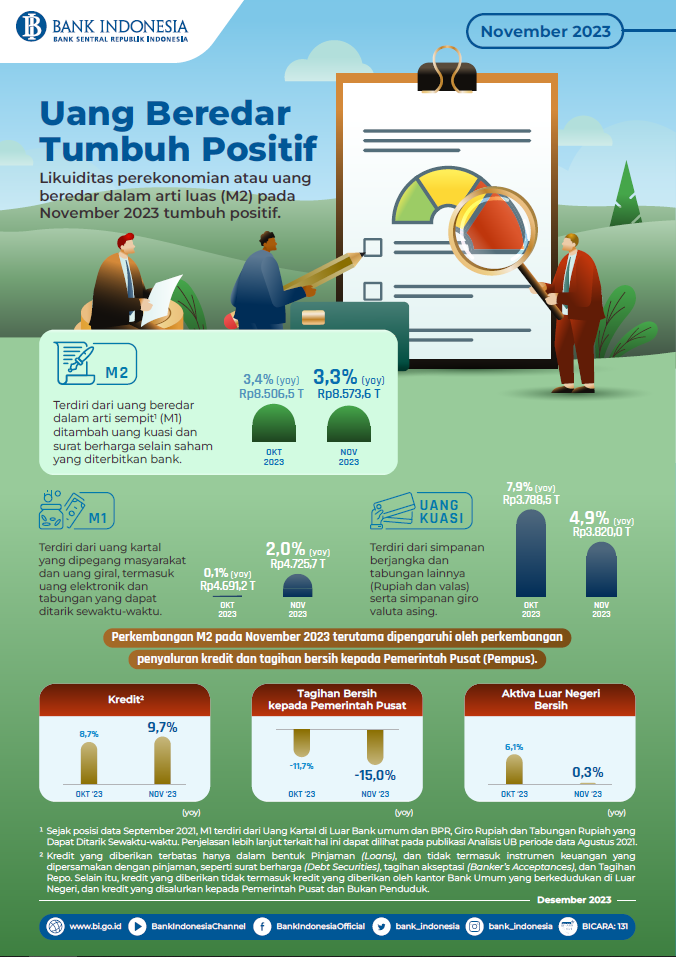 Likuiditas perekonomian atau uang beredar dalam arti luas (M2) pada November 2023 tumbuh positif. Posisi M2 pada November 2023 tercatat sebesar Rp8.573,6 triliun atau tumbuh 3,3% (yoy), relatif stabil dibandingkan pertumbuhan bulan sebelumnya. Perkembangan tersebut didorong oleh pertumbuhan uang beredar dalam arti sempit (M1) sebesar 2,0% (yoy) dan uang kuasi sebesar 4,9% (yoy).