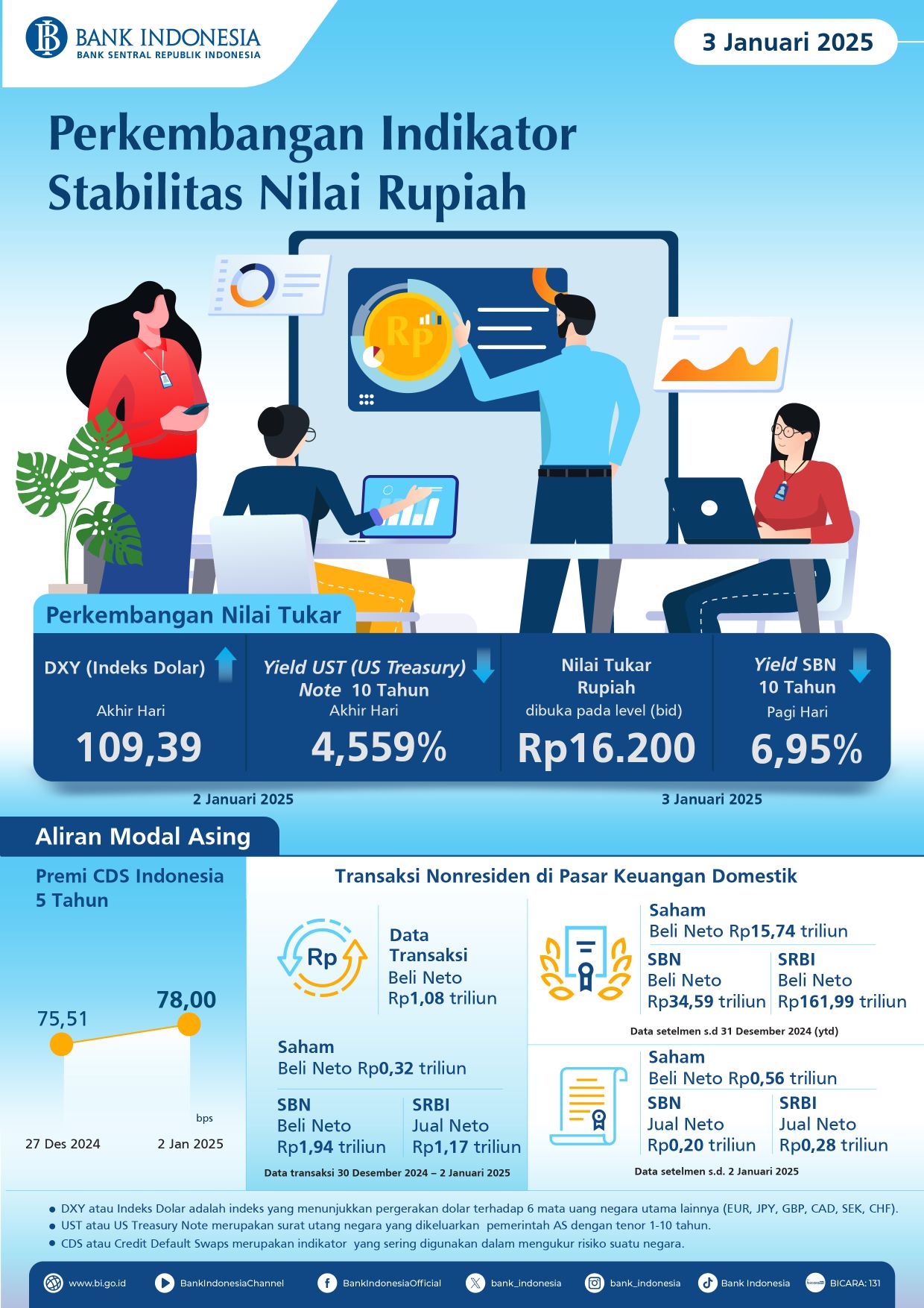- Berdasarkan data transaksi 30 Desember 2024 – 2 Januari 2025, nonresiden tercatat beli neto sebesar Rp1,08 triliun, terdiri dari beli neto Rp0,32 triliun di pasar saham, beli neto Rp1,94 triliun di pasar SBN, dan jual neto Rp1,17 triliun di Sekuritas Rupiah Bank Indonesia (SRBI).
