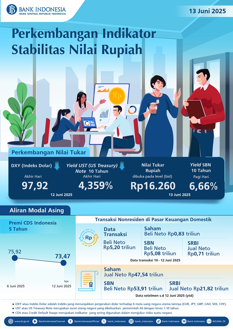 - Berdasarkan data transaksi 10 – 12 Juni 2025, nonresiden tercatat beli neto sebesar Rp5,20 triliun, terdiri dari beli neto sebesar Rp0,83 triliun di pasar saham dan Rp5,08 triliun di pasar SBN, serta jual neto sebesar Rp0,71 triliun di Sekuritas Rupiah Bank Indonesia (SRBI).