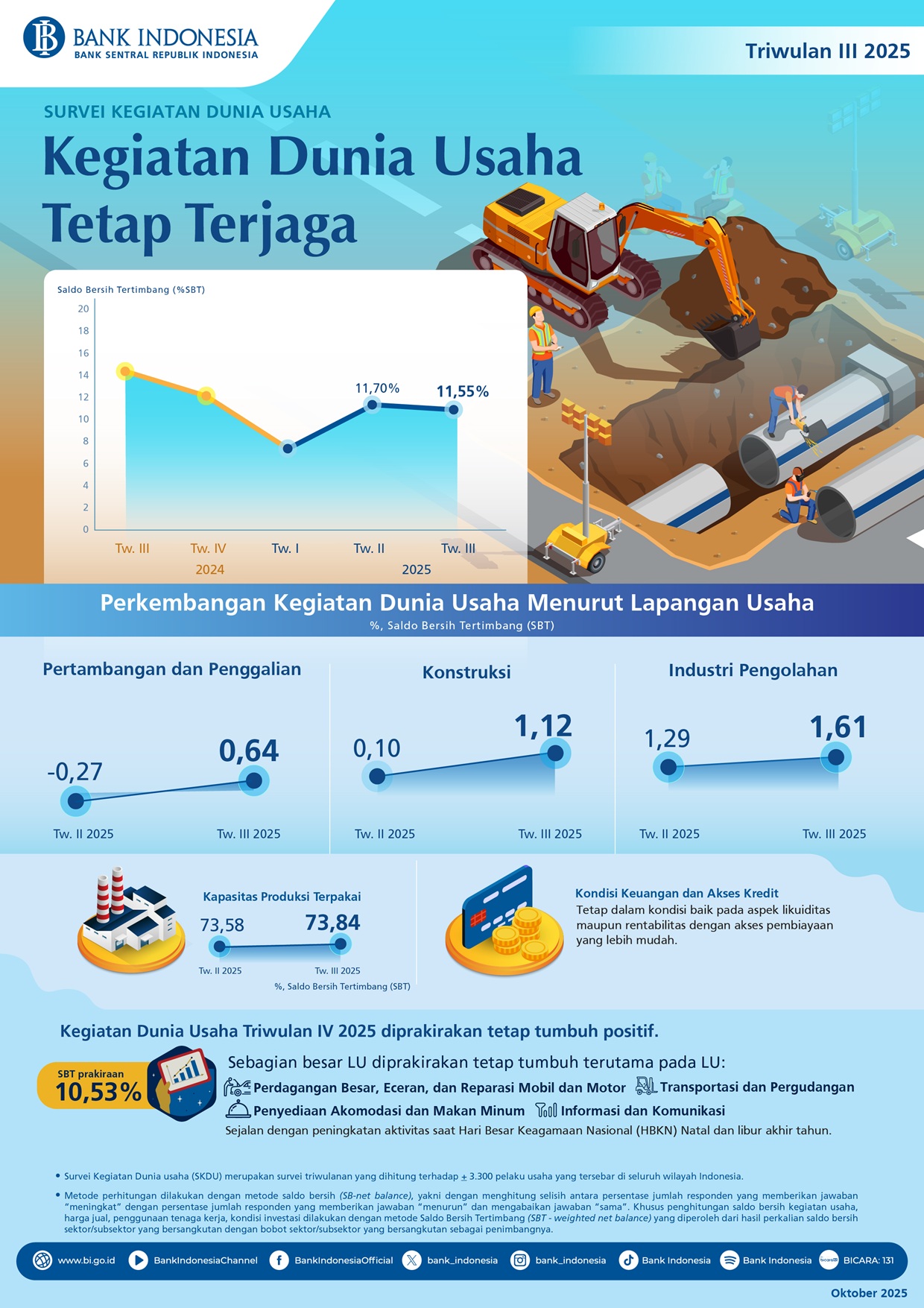 Hasil Survei Kegiatan Dunia Usaha (SKDU) mengindikasikan kinerja kegiatan dunia usaha tetap terjaga pada triwulan III 2025. Hal ini tecermin dari kinerja seluruh Lapangan Usaha (LU) yang tercatat positif dengan nilai Saldo Bersih Tertimbang (SBT) sebesar 11,55%, tidak jauh berbeda dengan SBT pada triwulan sebelumnya sebesar 11,70%. Kinerja sejumlah LU tercatat meningkat, terutama pada LU Pertambangan dan Penggalian, LU Konstruksi, LU Industri Pengolahan, LU Jasa Keuangan, serta LU Administrasi Pemerintahan, Pertahanan, dan Jaminan Sosial Wajib. Perkembangan ini dipengaruhi oleh peningkatan aktivitas usaha, pembangunan sejumlah proyek, dan realisasi anggaran Pemerintah sesuai pola kuartalan.
