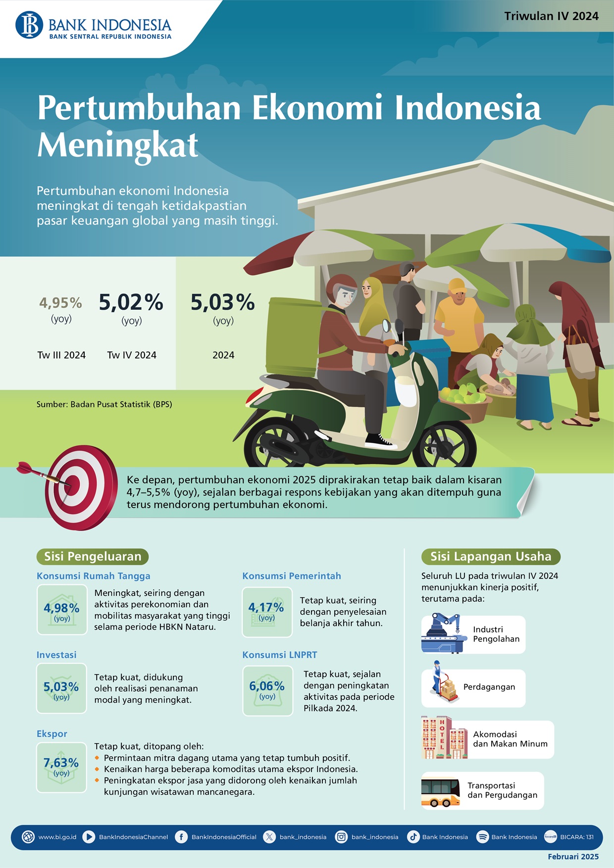 Pertumbuhan ekonomi Indonesia meningkat di tengah ketidakpastian pasar keuangan global yang masih tinggi. Data Badan Pusat Statistik (BPS) menunjukkan ekonomi triwulan IV 2024 tumbuh sebesar 5,02% (yoy), lebih tinggi dibandingkan dengan pertumbuhan ekonomi pada triwulan sebelumnya sebesar 4,95% (yoy). Dengan perkembangan tersebut, ekonomi Indonesia secara keseluruhan tahun 2024 tumbuh sebesar 5,03% (yoy). Ke depan, pertumbuhan ekonomi 2025 diprakirakan tetap baik dalam kisaran 4,7–5,5% (yoy), sejalan berbagai respons kebijakan yang akan ditempuh guna terus mendorong pertumbuhan ekonomi. Dalam kaitan ini, Bank Indonesia terus mengoptimalkan bauran kebijakannya untuk tetap menjaga stabilitas dan turut mendukung pertumbuhan ekonomi yang berkelanjutan. Upaya tersebut dilakukan dengan optimalisasi stimulus kebijakan makroprudensial dan akselerasi digitalisasi transaksi pembayaran yang ditempuh Bank Indonesia dengan kebijakan stimulus fiskal Pemerintah.