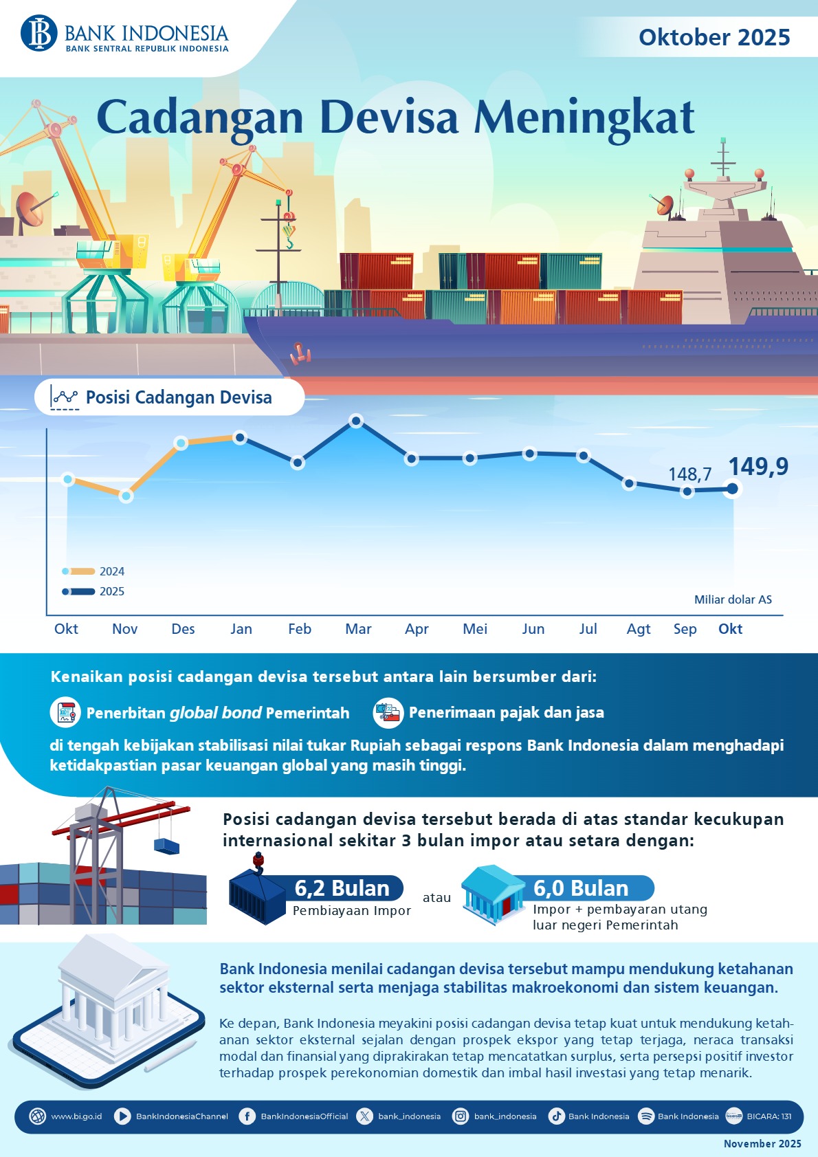 Posisi cadangan devisa Indonesia pada akhir Oktober 2025 tercatat sebesar 149,9 miliar dolar AS, meningkat dibandingkan posisi pada akhir September 2025 sebesar 148,7 miliar dolar AS. Kenaikan posisi cadangan devisa tersebut antara lain bersumber dari penerbitan global bond pemerintah serta penerimaan pajak dan jasa, di tengah kebijakan stabilisasi nilai tukar Rupiah Bank Indonesia dalam menghadapi ketidakpastian pasar keuangan global yang masih tinggi. Posisi cadangan devisa akhir Oktober 2025 setara dengan pembiayaan 6,2 bulan impor atau 6,0 bulan impor dan pembayaran utang luar negeri pemerintah serta berada di atas standar kecukupan internasional sekitar 3 bulan impor. Bank Indonesia menilai cadangan devisa ini mampu mendukung ketahanan sektor eksternal serta menjaga stabilitas makroekonomi dan sistem keuangan.
