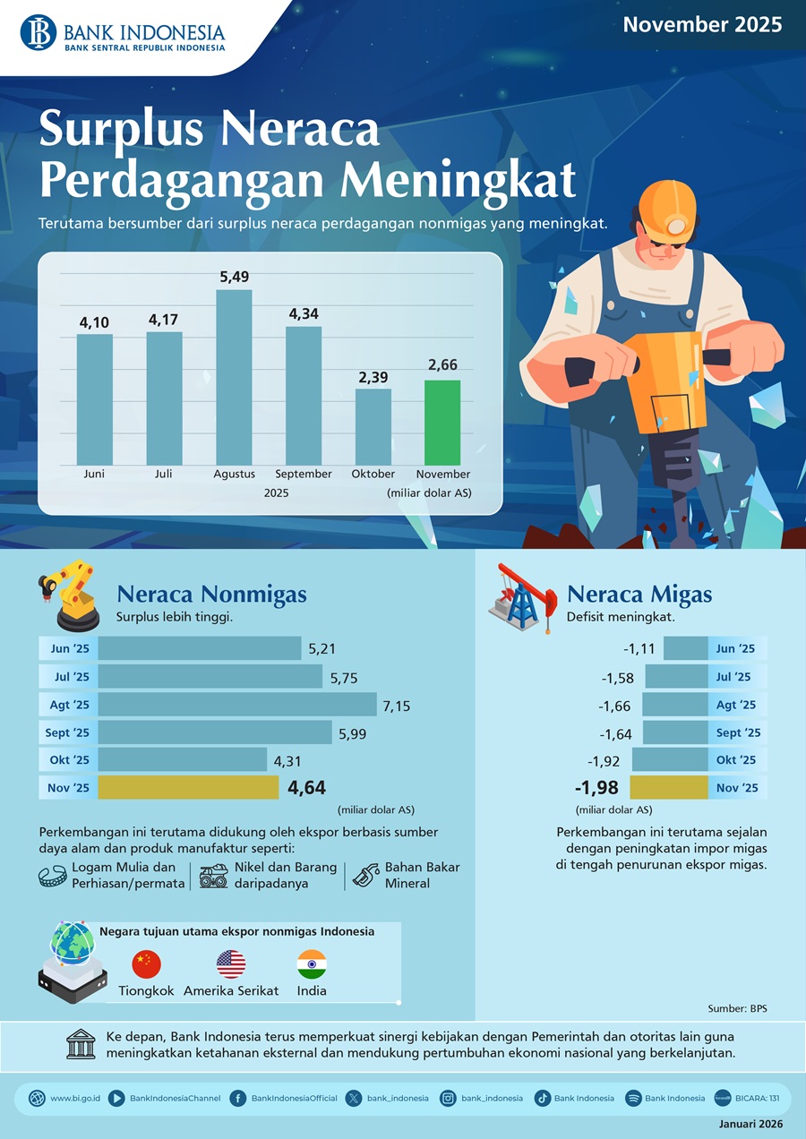 Berdasarkan data Badan Pusat Statistik (BPS), neraca perdagangan Indonesia pada November 2025 mencatat surplus sebesar 2,66 miliar dolar AS, meningkat dibandingkan surplus pada Oktober 2025 sebesar 2,39 miliar dolar AS. Bank Indonesia memandang surplus neraca perdagangan ini positif untuk menopang ketahanan eksternal perekonomian Indonesia lebih lanjut. Ke depan, Bank Indonesia terus memperkuat sinergi kebijakan dengan Pemerintah dan otoritas lain guna meningkatkan ketahanan eksternal dan mendukung pertumbuhan ekonomi nasional yang berkelanjutan.