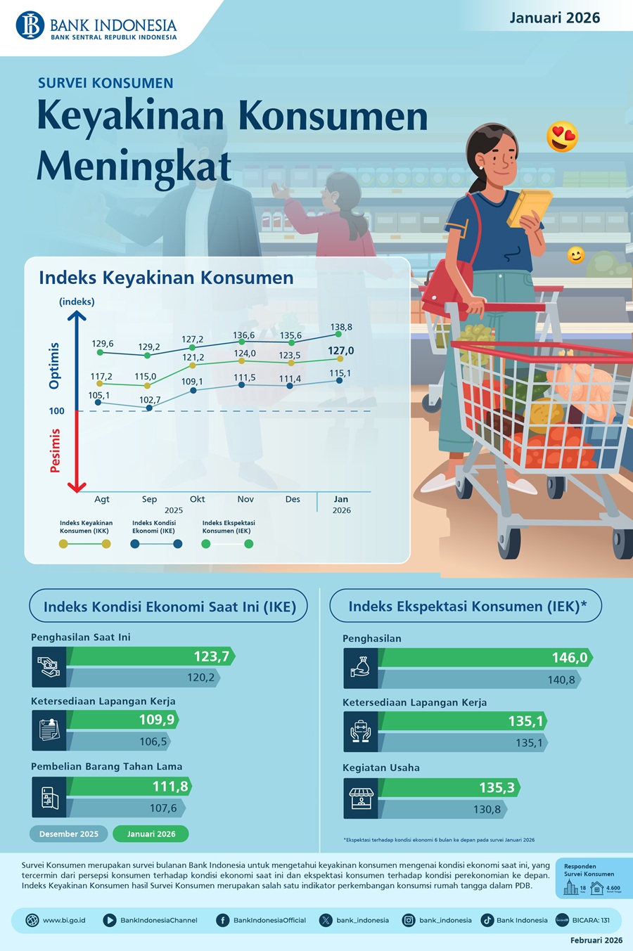 Survei Konsumen Bank Indonesia pada Januari 2026 mengindikasikan keyakinan konsumen terhadap kondisi ekonomi meningkat dibandingkan dengan bulan sebelumnya. Hal ini tecermin dari Indeks Keyakinan Konsumen (IKK) Januari 2026 yang berada pada level optimis (indeks >100) sebesar 127,0, lebih tinggi dibandingkan dengan indeks bulan sebelumnya sebesar 123,5.